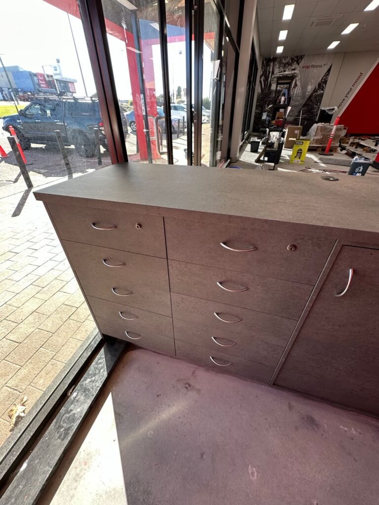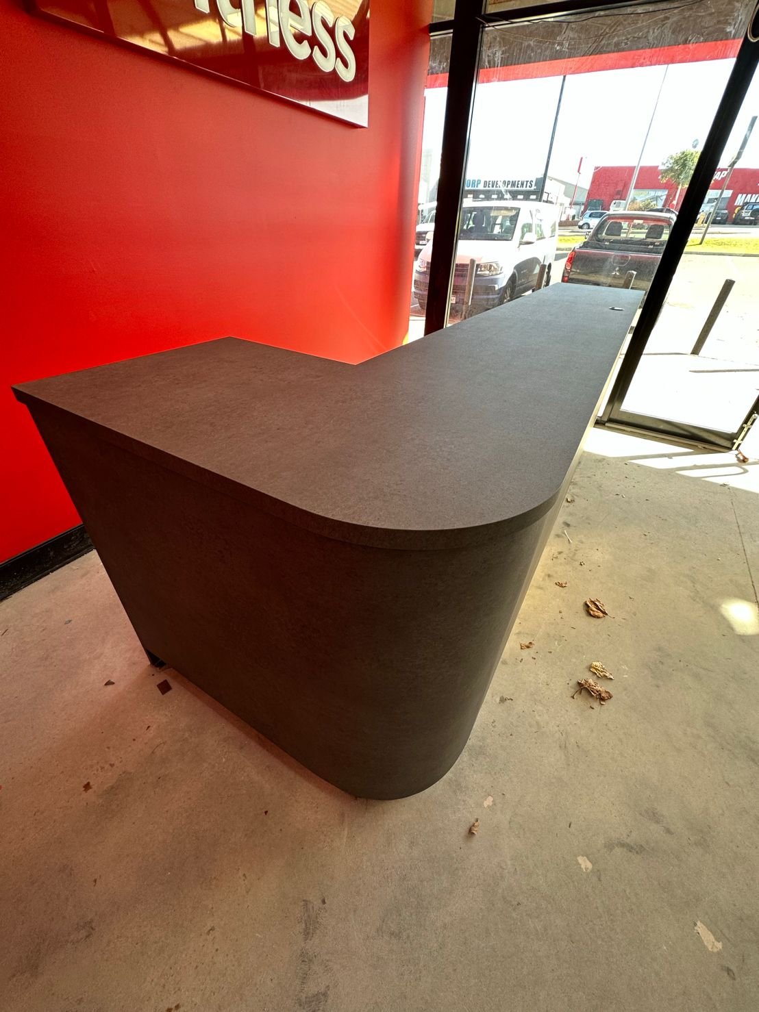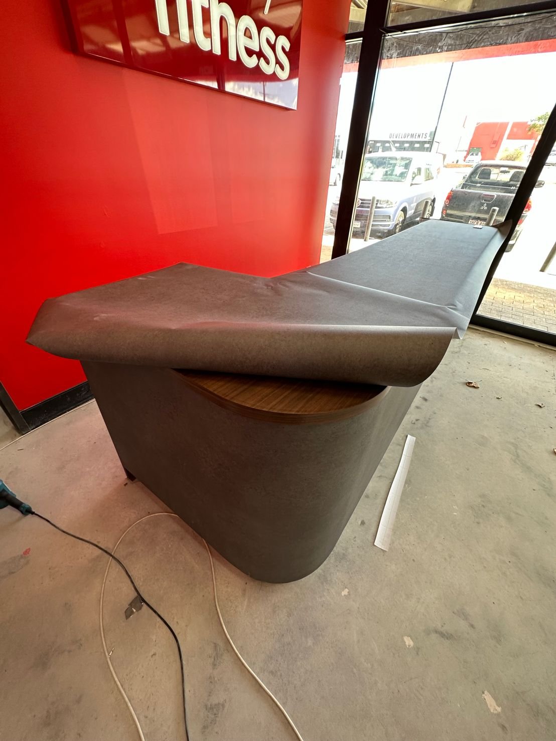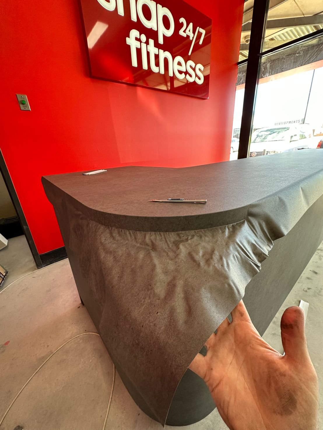 We were thrilled to be part of the post-fire renovation project at Snap Fitness, where we had the opportunity to transform their surviving furniture into a stunning new finish. After an unexpected fire, the interior required extensive renovations, but there was potential for salvaging and refurbishing the existing furniture pieces. By wrapping the desk in a dark mortar stone effect, we achieved a remarkable transformation that breathed new life into the space. The contrasting desk against the vibrant red Snap Fitness feature wall creates a visually striking and modern aesthetic. Not only did this project save the furniture from ending up in a landfill, but it also added a fresh feeling and revamped interior. We are proud to have played a part in this renovation project.