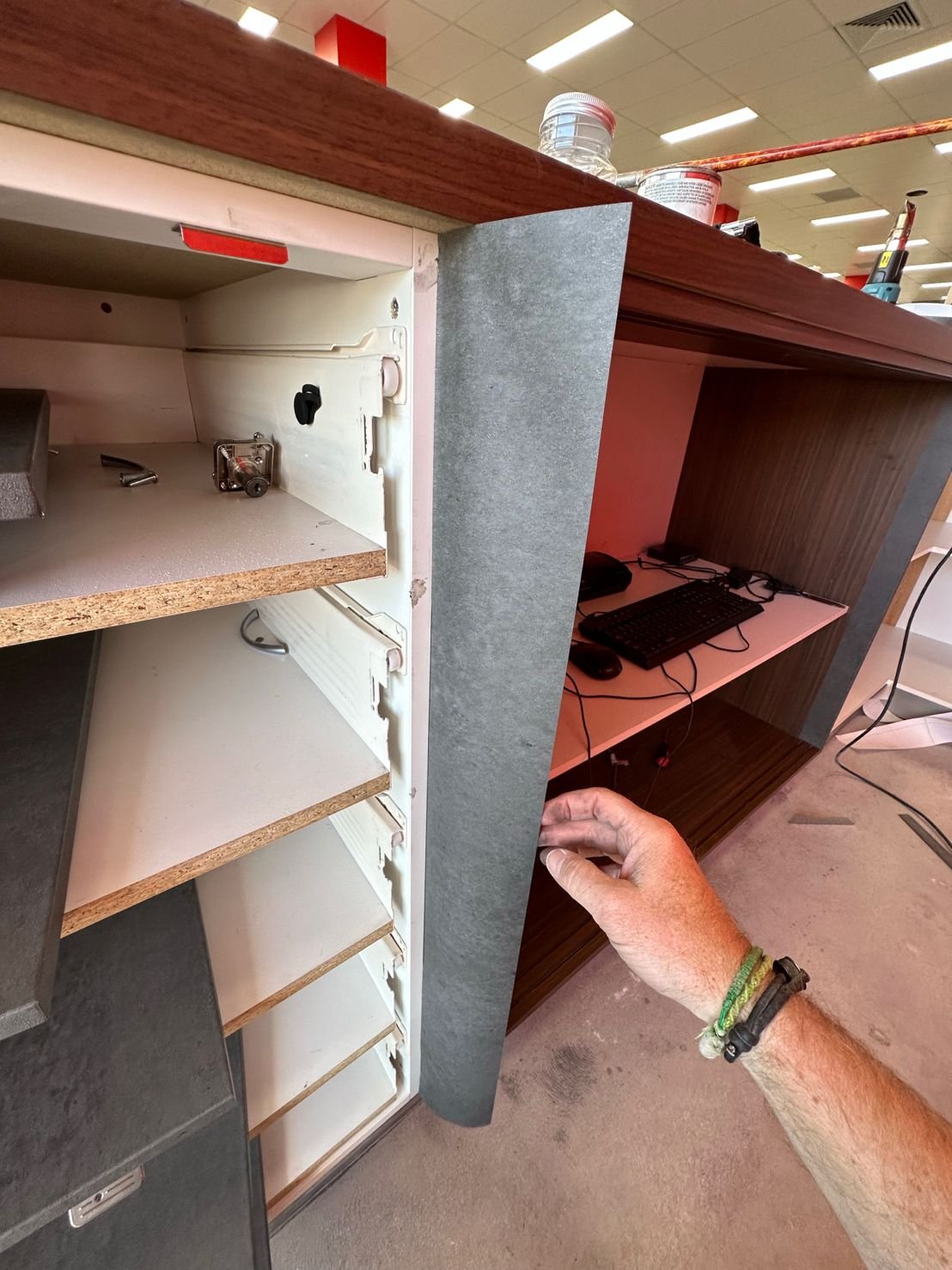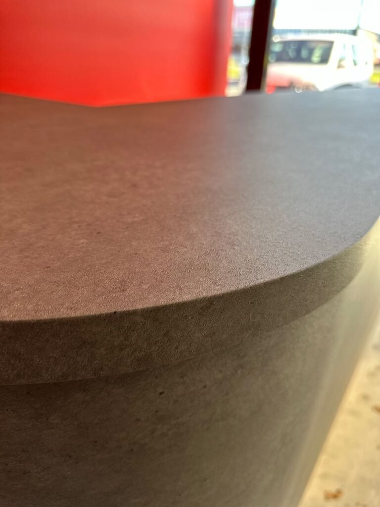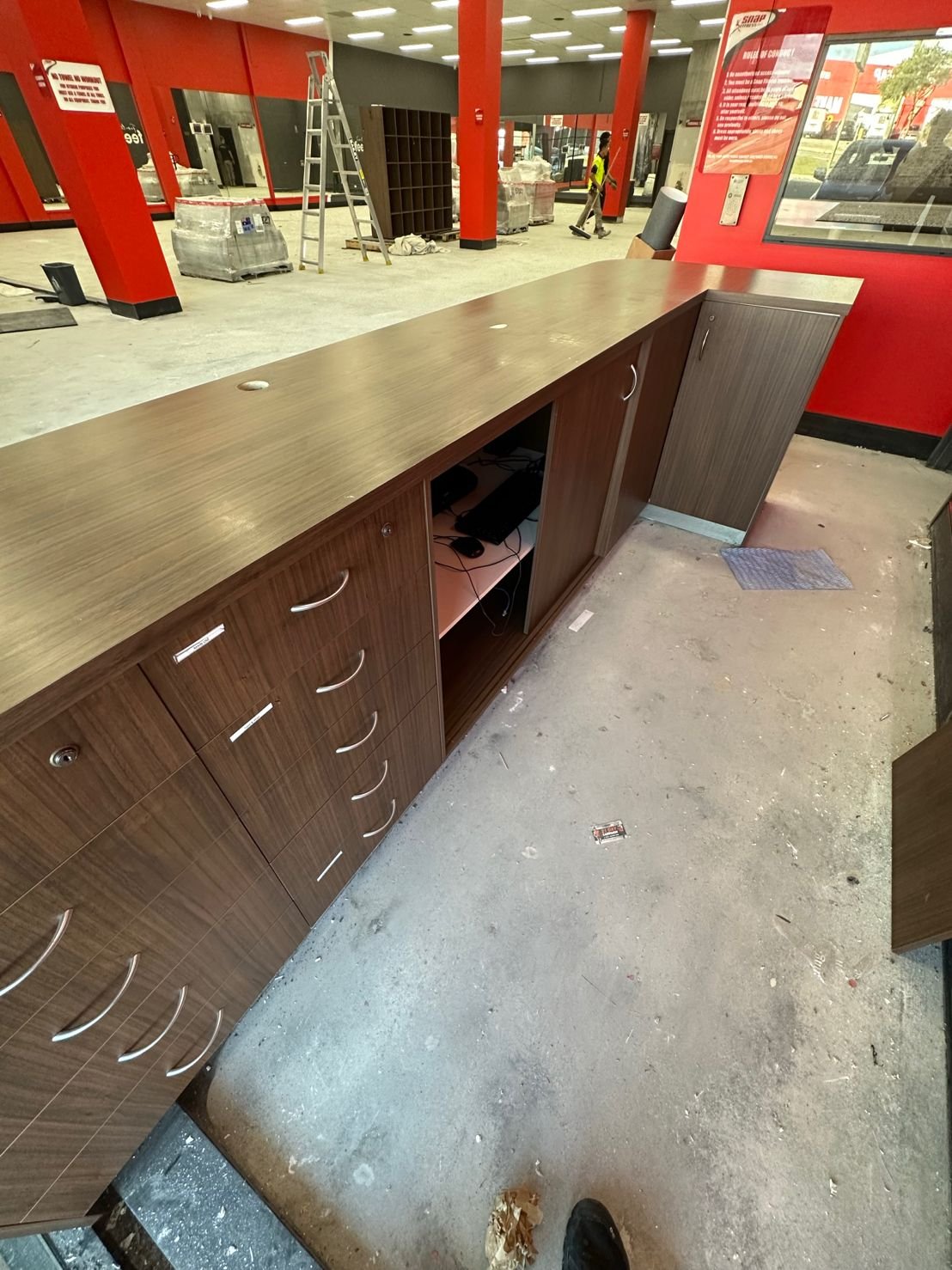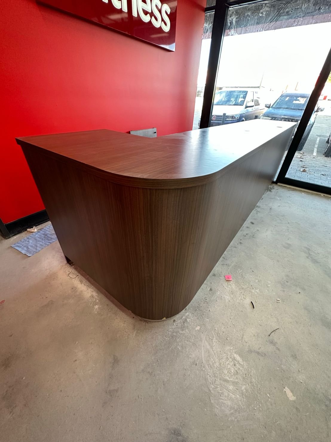 We were thrilled to be part of the post-fire renovation project at Snap Fitness, where we had the opportunity to transform their surviving furniture into a stunning new finish. After an unexpected fire, the interior required extensive renovations, but there was potential for salvaging and refurbishing the existing furniture pieces. By wrapping the desk in a dark mortar stone effect, we achieved a remarkable transformation that breathed new life into the space. The contrasting desk against the vibrant red Snap Fitness feature wall creates a visually striking and modern aesthetic. Not only did this project save the furniture from ending up in a landfill, but it also added a fresh feeling and revamped interior. We are proud to have played a part in this renovation project.