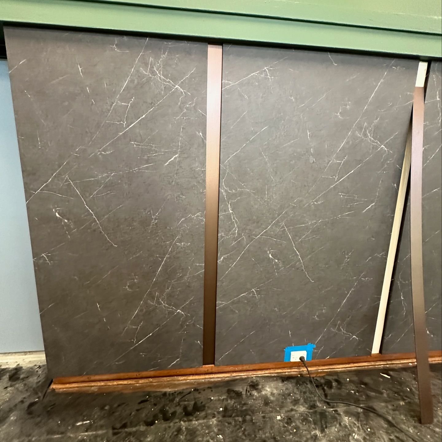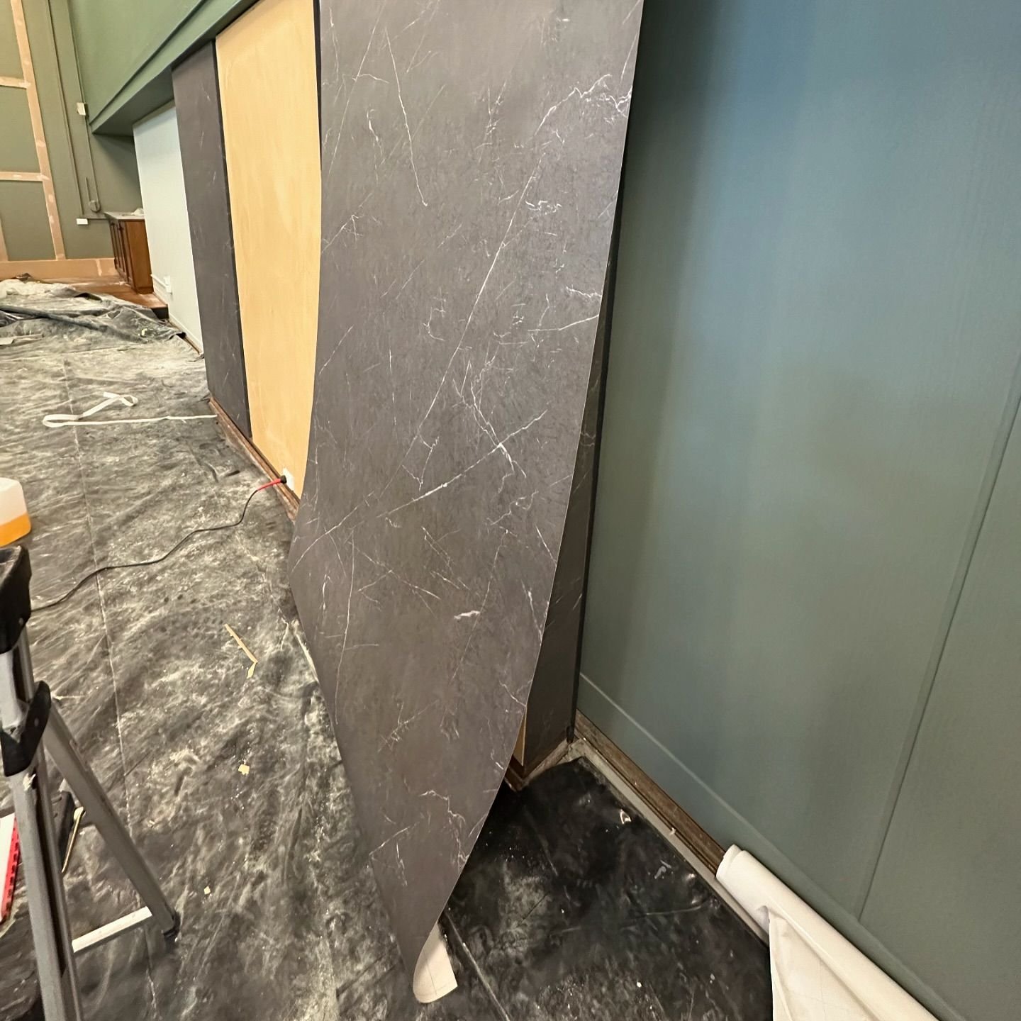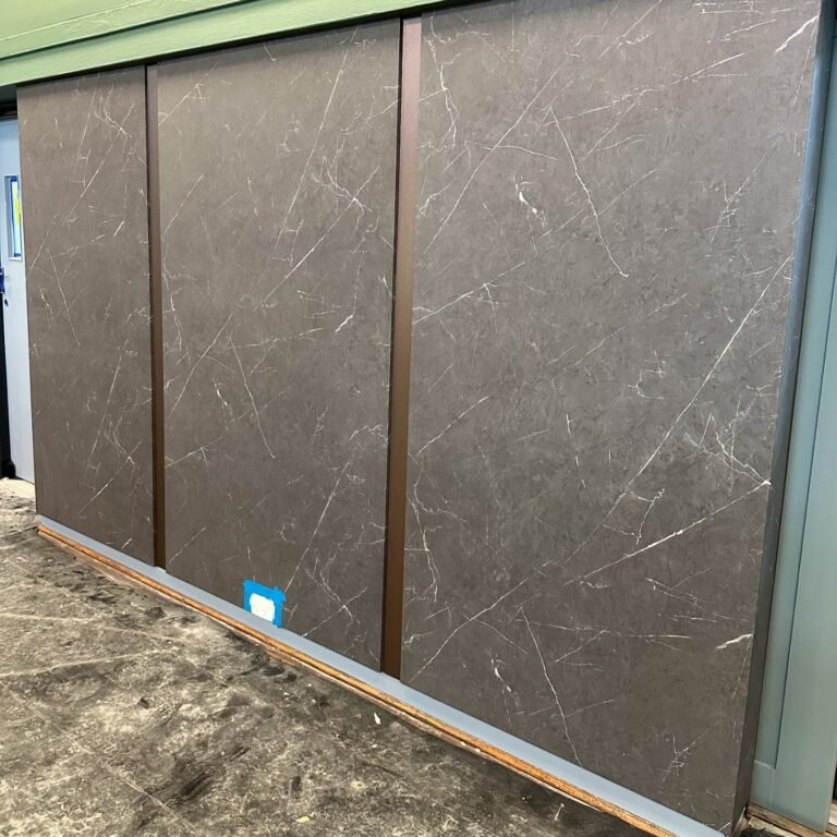 The feature walls were fitted with primed MDF boards and wrapped in PM007 vinyl to create a striking 3D marble stepped design. This was complemented by the nook surrounding the serving hatch, while composite boards were installed over the tiled kitchen wall to provide a sleek and cohesive finish.